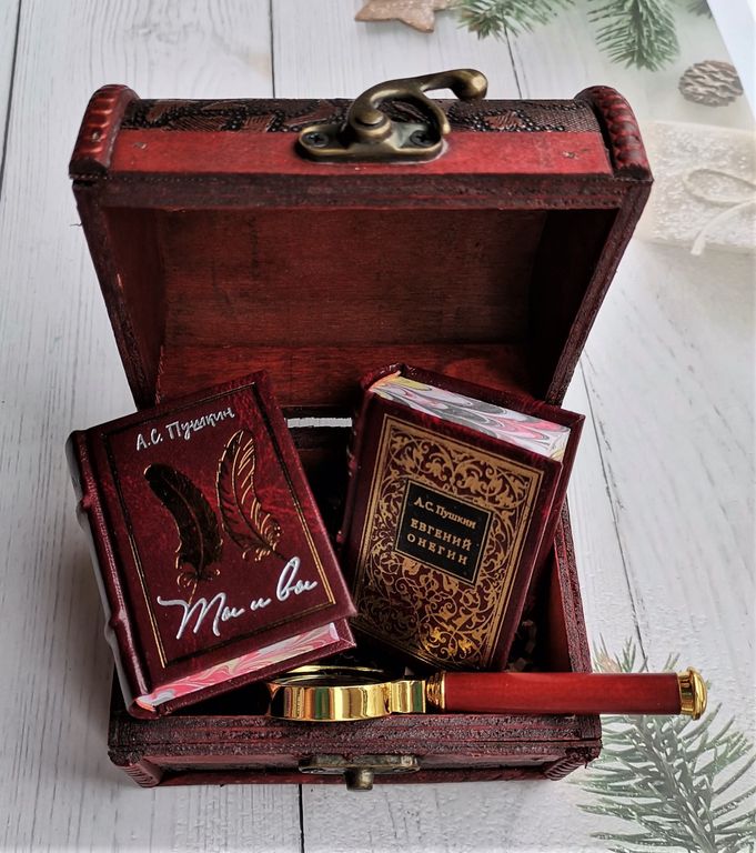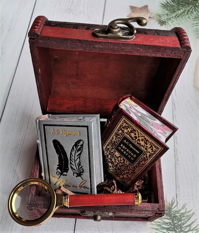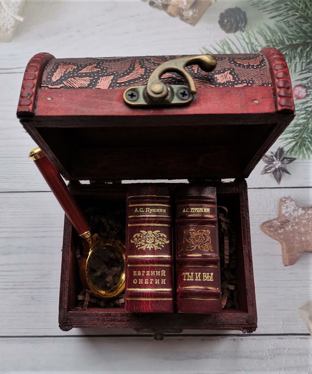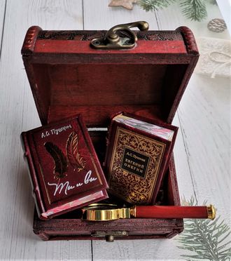Комплект из мини-книг Александра Пушкина"Ты и Вы" и "Евгений Онегин" в ручном переплете, с мраморным трехсторонним обрезом в сундучке с лупой.