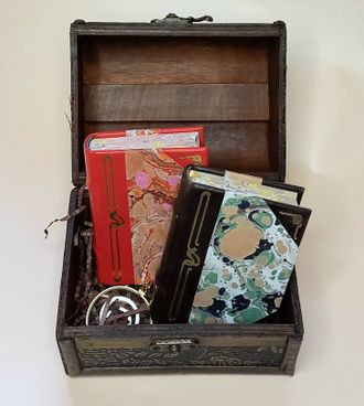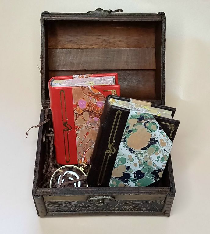 Комплект из двух миниатюрных книг в ручном составном переплете из кожи с мраморной бумагой работы нашего издательства,