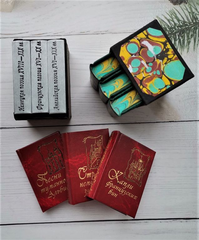 Подарочный комплект из трех миниатюрных книг в ручном переплете, мраморный трехсторонний обрез.