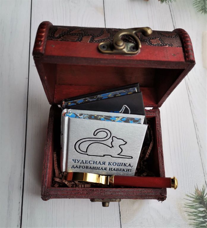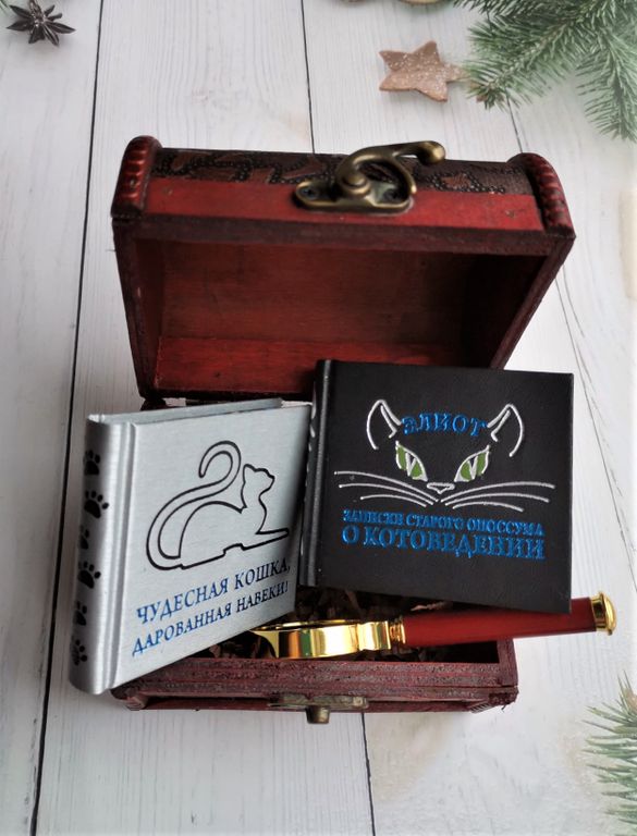 Комплект из двух миниатюрных книг в ручном переплете в сундучке с лупой, мраморный трехсторонний обрез.